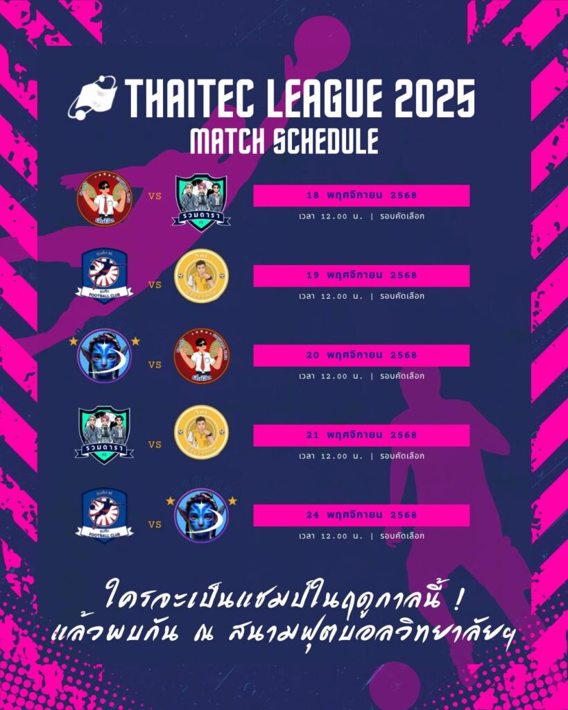 ศึกฟุตบอล Thaitec League 2025 ใกล้ระเบิดความมันส์แล้ว! นัดเปิดสนามสุดยิ่งใหญ่จะมีขึ้นใน วันจันทร์ที่ 17 พฤศจิกายน 2568 ณ สนามฟุตบอลของวิทยาลัยฯ เริ่มเชียร์พร้อมกันตั้งแต่ เวลา 12.00 น. เป็นต้นไป
