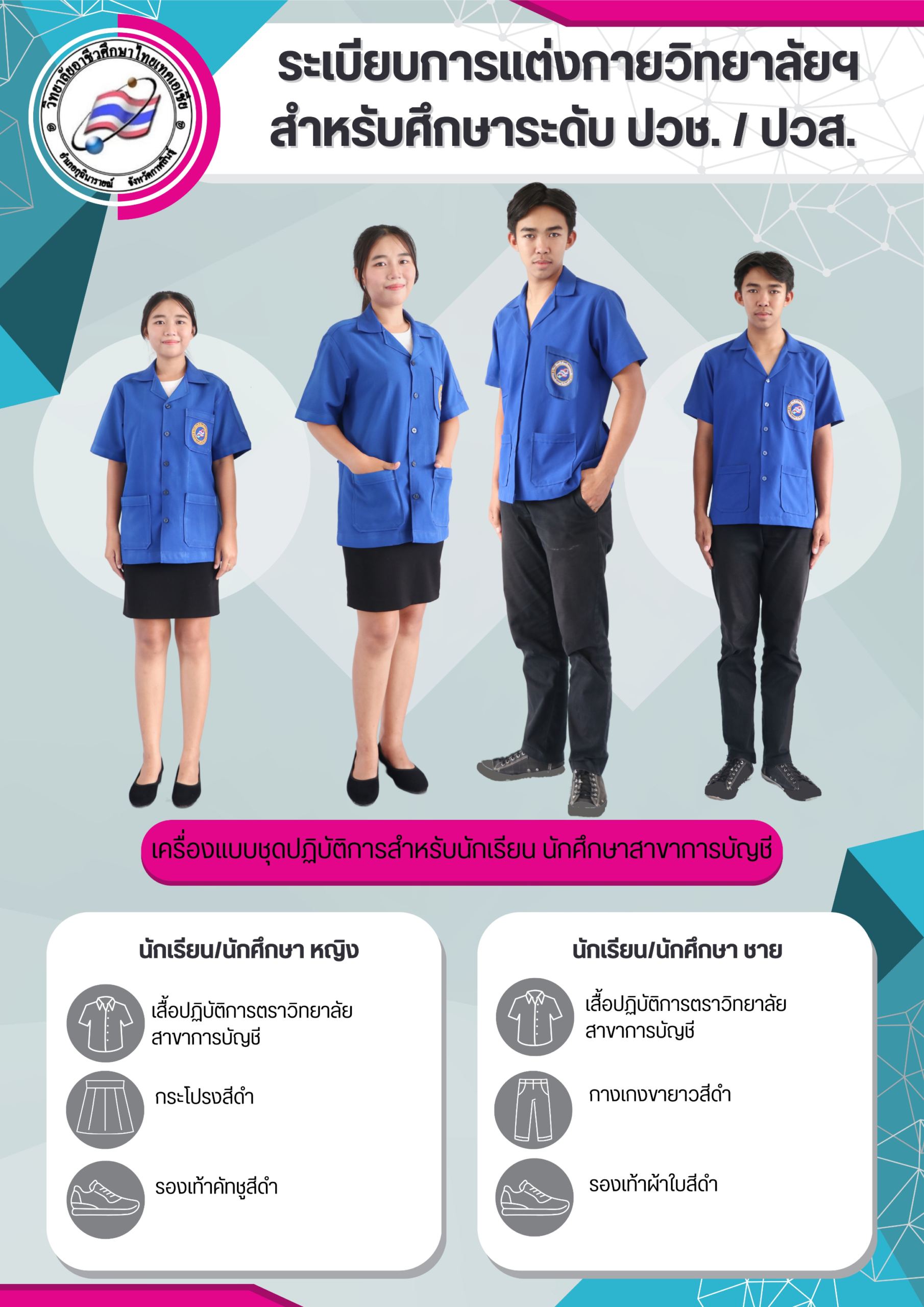 ระเบียบการแต่งกายนักเรียน นักศึกษา วิทยาลัยอาชีวศึกษาไทยเทคเอเชีย เครื่องแบบนักเรียนระดับ ปวช. เครื่องแบบนักเรียนระดับปวส. เครื่องแบบชุดพละทุกระดับชั้น เครื่องแบบชุดปฏิบัติการสาขาการบัญชี เครื่องแบบชุดปฏิบัติการสาขาเทคโนโลยีธุรกิจดิจิทัล เครื่องแบบชุดปฏิบัติการสาขาช่างยนต์และช่างไฟฟ้า เครื่องแบบนักเรียนระดับ ปวช. เครื่องแบบนักเรียนระดับ ปวส. เครื่องแบบชุดพละทุกระดับชั้น เครื่องแบบชุดปฏิบัติการระดับ ปวช./ปวส. สาขาการบัญชี เครื่องแบบชุดปฏิบัติการระดับ ปวช./ปวส. สาขาเทคโนโลยีธุรกิจดิจิทัล เครื่องแบบชุดปฏิบัติการระดับ ปวช./ปวส. สาขาช่างยนต์และช่างไฟฟ้า